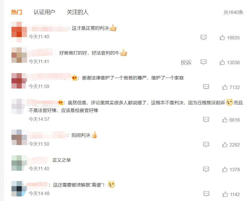 网友评论道:“这才是正常的判决”、“谢谢法律维护了一个爸爸的尊严,维护了一个家庭”、“正义之举”......