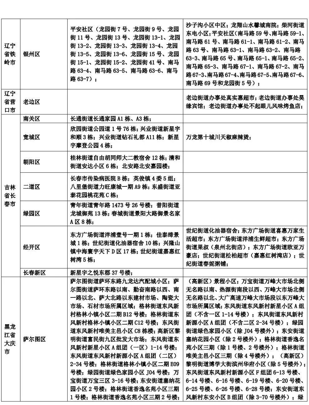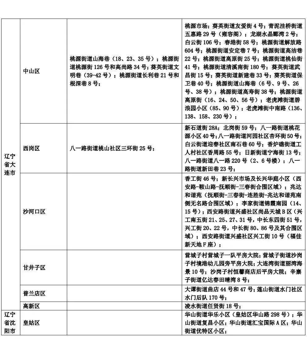 富云花都核酸采样点、满堂红棋牌社小北一东路店(铁西区北一东路67甲2号2门)、每之购便利店富云花都店(铁西区兴工北街7号20门)、万盛园炖肉馆云峰店(铁西区云峰北街35号)、易购便利店兴工北街店(铁西区兴工北街7号19门)、公和桥第2流动核酸采样点、金龙烧烤西塔店(和平区珲春南路7号)