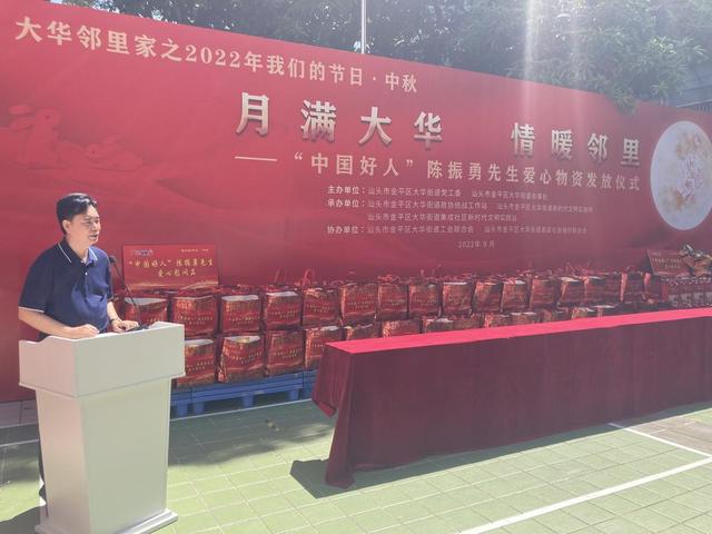 同日,在金平区大华街道集成社区文化广场,一场以“月满大华 情暖邻里”为主题的爱心物资发放仪式在此举行。现场,金平区领导、陈振勇和有关部门负责同志现场慰问独居老人和保洁员,亲手把慰问品送到他们的手上,把真情的关爱送到群众的心坎上。