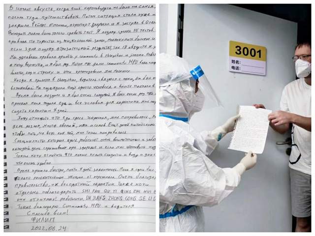 写信人名叫菲利普,日前从三亚返回,按照高中风险地区疫情防控政策,菲利普需接受7天的集中隔离,因长期生活在俄罗斯和英国,生活饮食习惯不适应,加上语言不通,无法和隔离点工作人员开展交流,工作人员也无法获知他生活上的困难,幸运的是,工作人员成功联系上了菲利普的翻译,经过多次沟通交流后,得知他的生活饮食习惯,并每天通过翻译关心菲利普在隔离点的日常生活起居,解决菲利普生活上的需求,这让在异国他乡的菲利普非常感动,菲利普在信中写道:从第一天起,我就深刻体会到了隔离点周到的服务,工作人员每天按时采集核酸和测量体温、微信询问情况、一日三餐配送,还有精心给我准备的糖果和葡萄,特别是那个中药包,喝起来很像茶,我很喜欢喝。如果明天可以回家,现在我想以文字的方式表达最真诚的感谢。害怕—担忧—冷静—安心是我这几天的心路历程。安心皆来源于所有工作人员,遇到你们,所有顾虑,烟消云散。我们皆是普通人,可你们是普通人中的不平凡之人,一日三餐,每次敲门都直抵内心;被防护服束缚的步伐显的些许沉重、辛苦,但这是希望和信念。你们的敬业、勇敢、善良、默默付出有目共睹。愿你们平安、幸福、快乐。