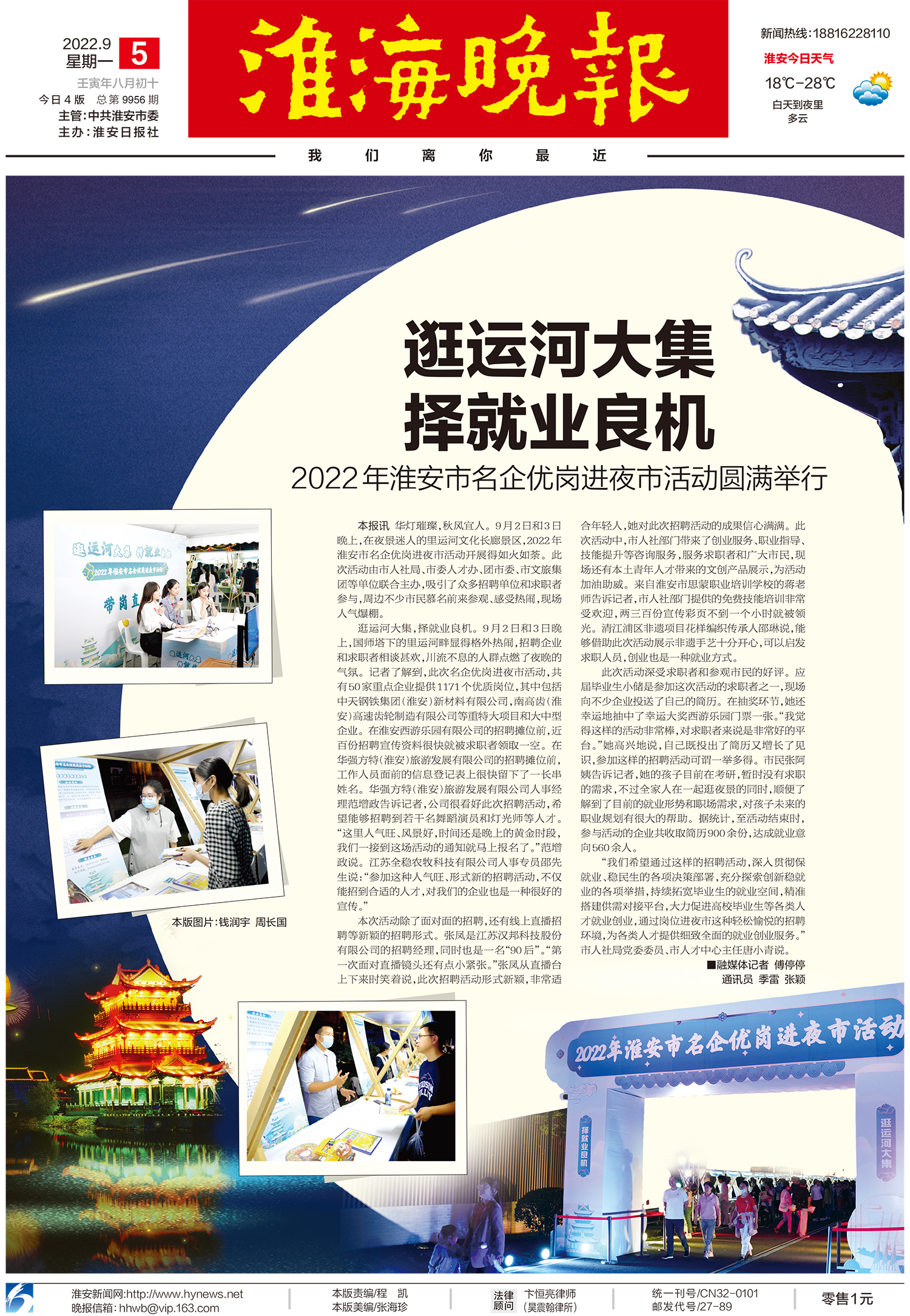 逛运河大集,择就业良机。9月2日和3日晚上,国师塔下的里运河畔显得格外热闹,招聘企业和求职者相谈甚欢,川流不息的人群点燃了夜晚的气氛。记者了解到,此次名企优岗进夜市活动,共有50家重点企业提供1171个优质岗位,其中包括中天钢铁集团(淮安)新材料有限公司,南高齿(淮安)高速齿轮制造有限公司等重特大项目和大中型企业。在淮安西游乐园有限公司的招聘摊位前,近百份招聘宣传资料很快就被求职者领取一空。在华强方特(淮安)旅游发展有限公司的招聘摊位前,工作人员面前的信息登记表上很快留下了一长串姓名。华强方特(淮安)旅游发展有限公司人事经理范增政告诉记者,公司很看好此次招聘活动,希望能够招聘到若干名舞蹈演员和灯光师等人才。“这里人气旺、风景好,时间还是晚上的黄金时段,我们一接到这场活动的通知就马上报名了。”范增政说。江苏全稳农牧科技有限公司人事专员邵先生说:“参加这种人气旺、形式新的招聘活动,不仅能招到合适的人才,对我们的企业也是一种很好的宣传。”