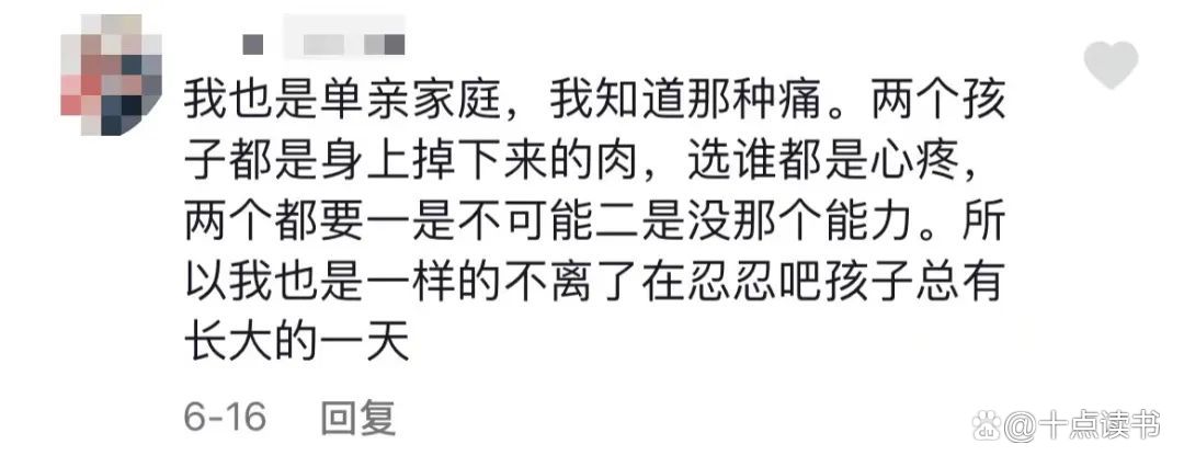 我是单亲家庭,我知道那种痛。两个孩子都是身上掉下来的肉,选谁都是心疼。所以我也是一样的不离了,忍忍吧,孩子总有长大的一天。
