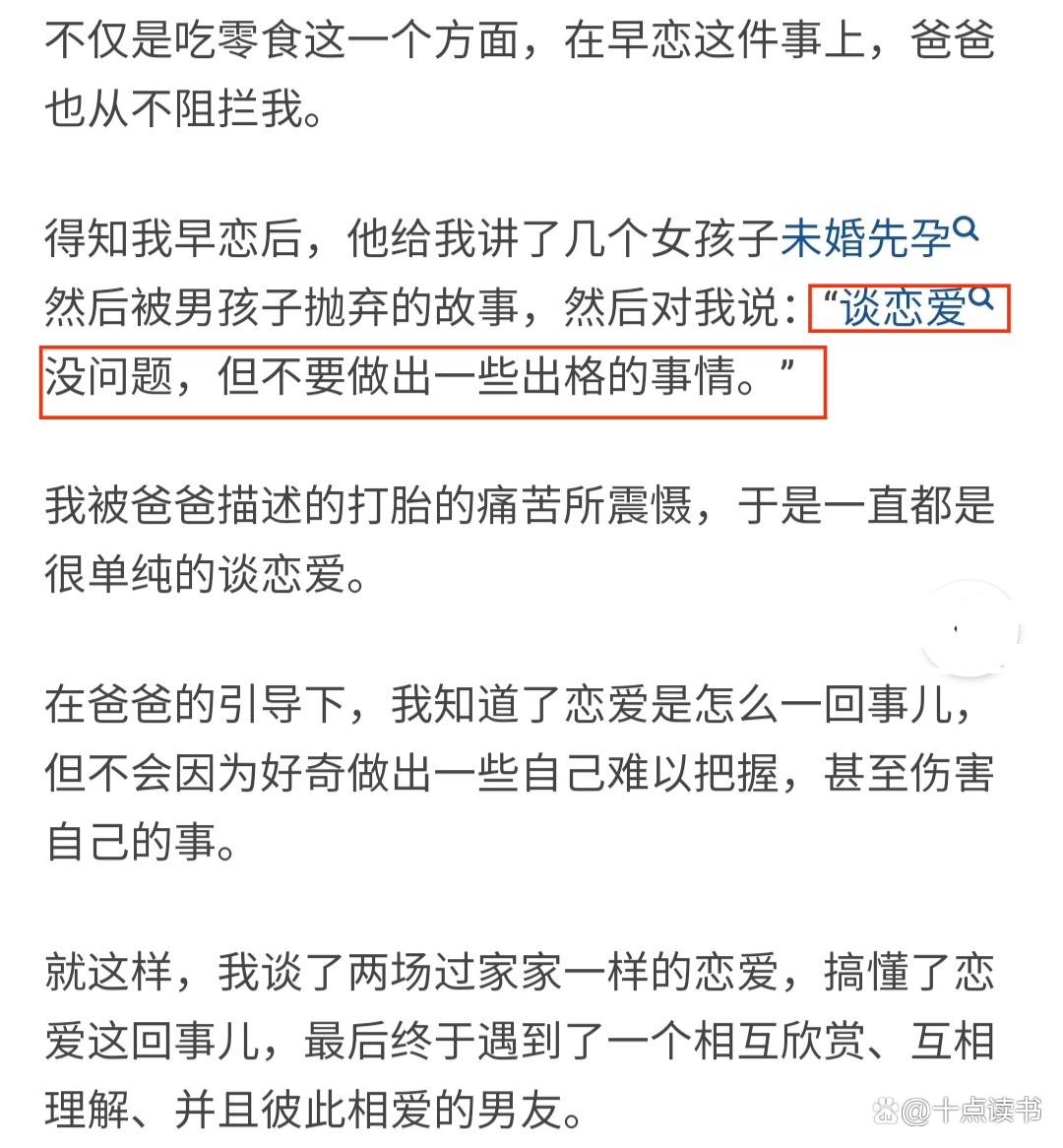但是爸爸经常用女孩未婚先孕被男孩抛弃的故事引导她:“谈恋爱没问题,但不要做出一些出格的事情。”