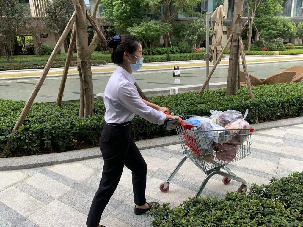“王姐,这些是你点的东西。猪肉、矿泉水、青菜……你看一下。”手提大包小包的瓜果时蔬,马不停蹄为业主们送货上门的并非“外卖小哥”,而是西派金沙的物业人员。此前,在西派金沙居家隔离的业主给物业人员发送了一条微信信息,请他们帮忙将采购一周的物资送上来,物业人员收到消息后立刻化身“管家”提供跑腿服务。