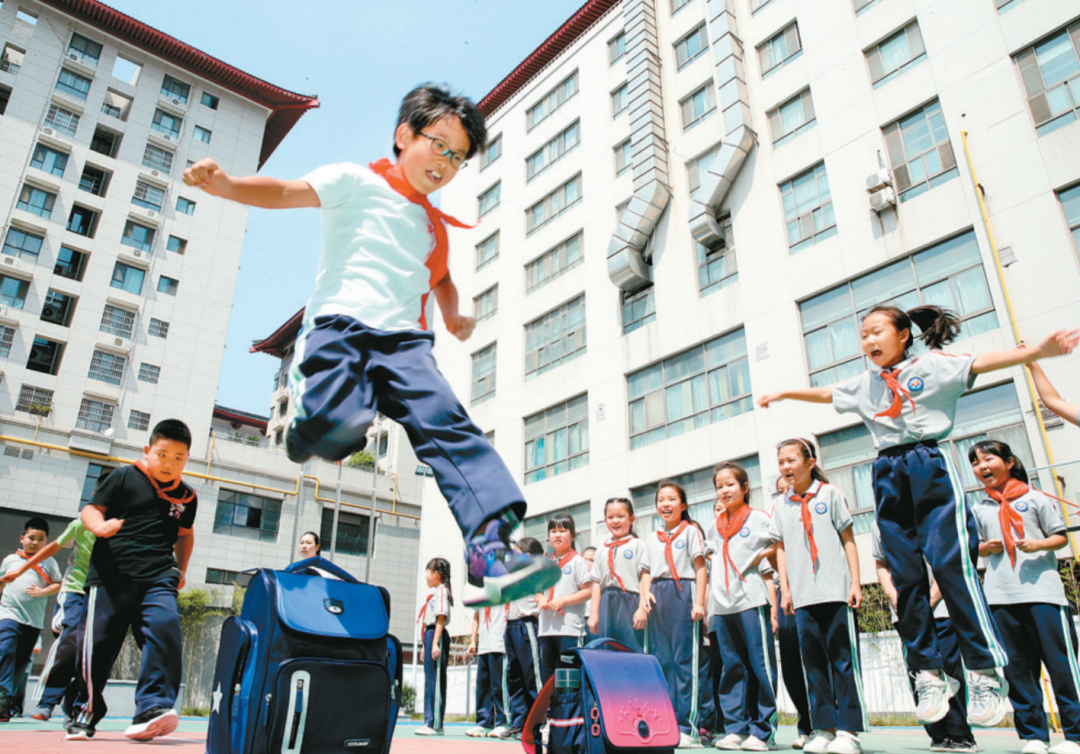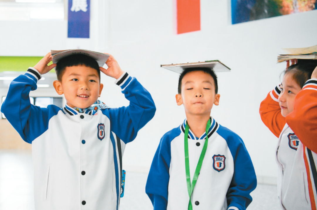 航天城第一小学东校区一年级新生在新建的教学楼内互动玩耍,开启全新的小学生活。
