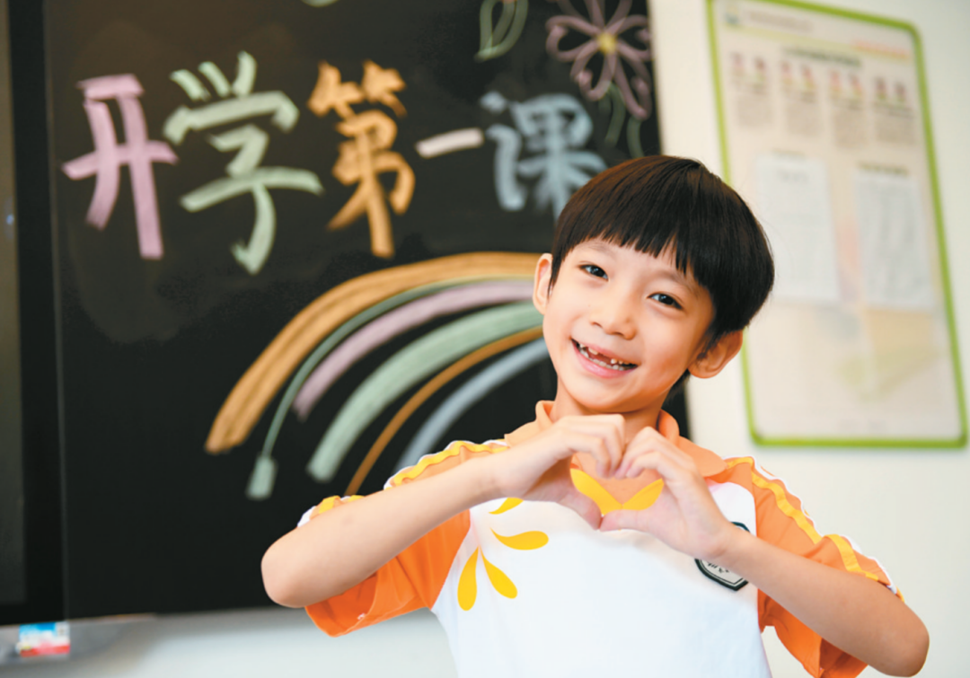长安区第四小学一年级新生在“开学第一课”后比心。