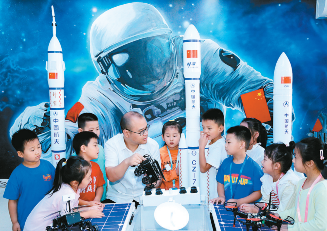 莲湖第二学校一年级新生在航空航天教室聆听信息技术老师讲解航天知识。