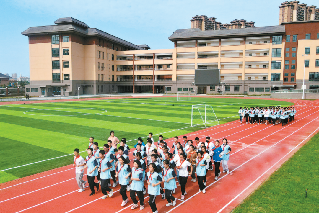 碑林区五味什字小学学生在新建的校园内进行跨越障碍游戏。
