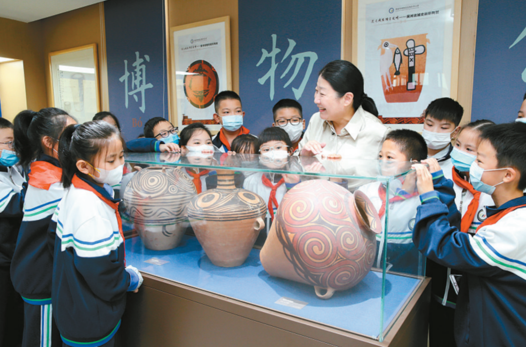 碑林区五味什字小学学生在老师的带领下参观校园博物馆。