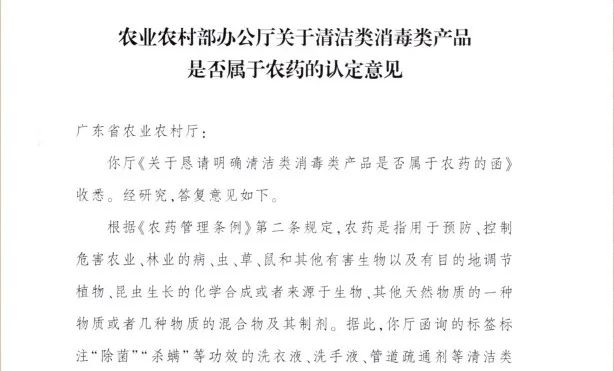 近日,农业农村部就清洁类消毒类产品是否属于农药明确认定意见,并答复有关单位。答复意见如下: