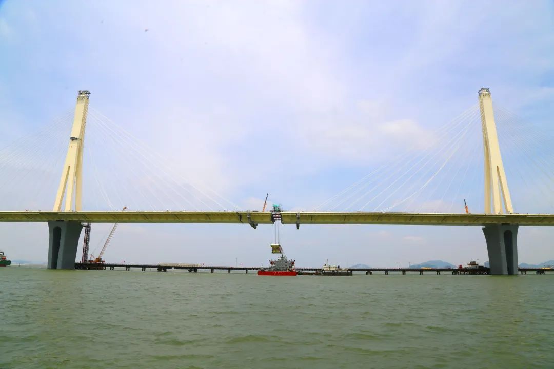 珠机城际金海特大桥全长1369米,起自珠海横琴新区,跨越西江磨刀门水道,终至珠海机场东路,是珠机城际铁路二期关键控制性工程。大桥首次采用多塔刚构体系公铁两用斜拉桥结构,主跨为3×340米的公铁同层四塔斜拉桥,中间为160公里/小时的双线城际铁路,两侧为100公里/小时的双向六车道高速公路。