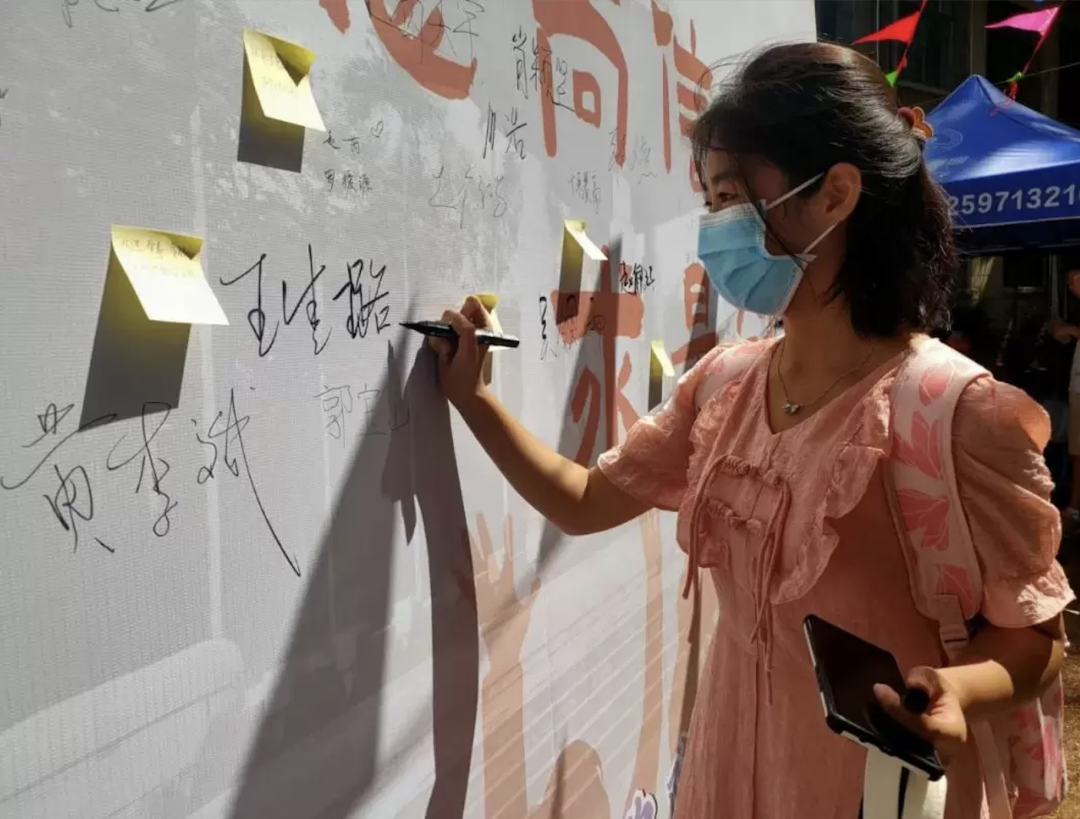 建筑学院同样别出心裁,将活动平台分设两个板块,在迎新的同时满足防疫要求。其中,一楼平台有寄语墙,新生写下对大学生活的展望;三楼平台特别安排了摄像与采访,记录新生入学时刻;