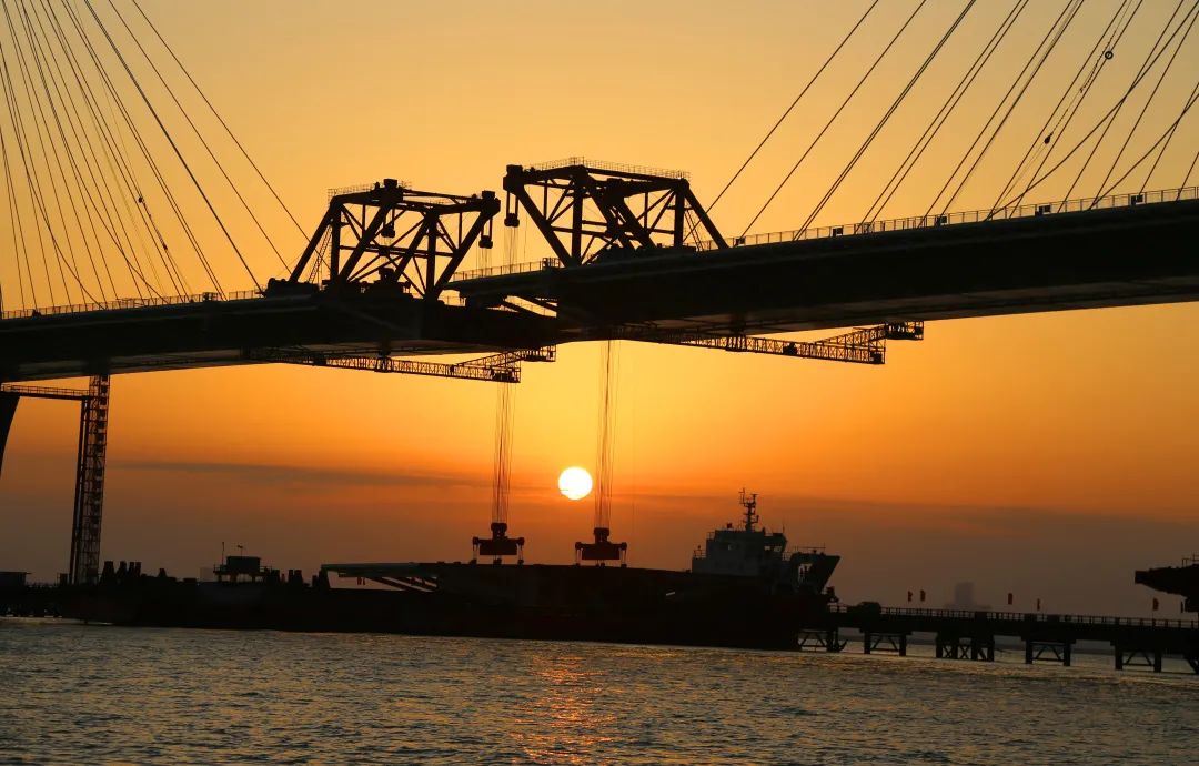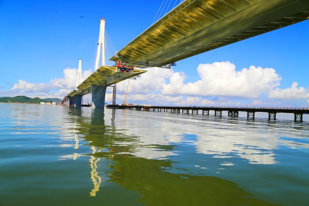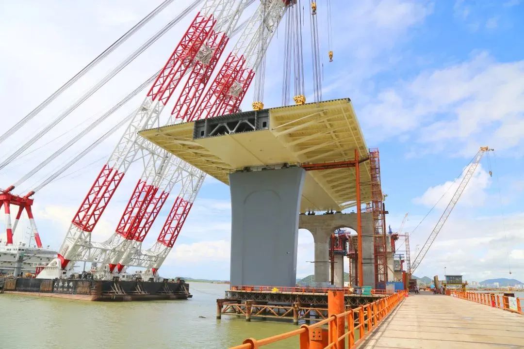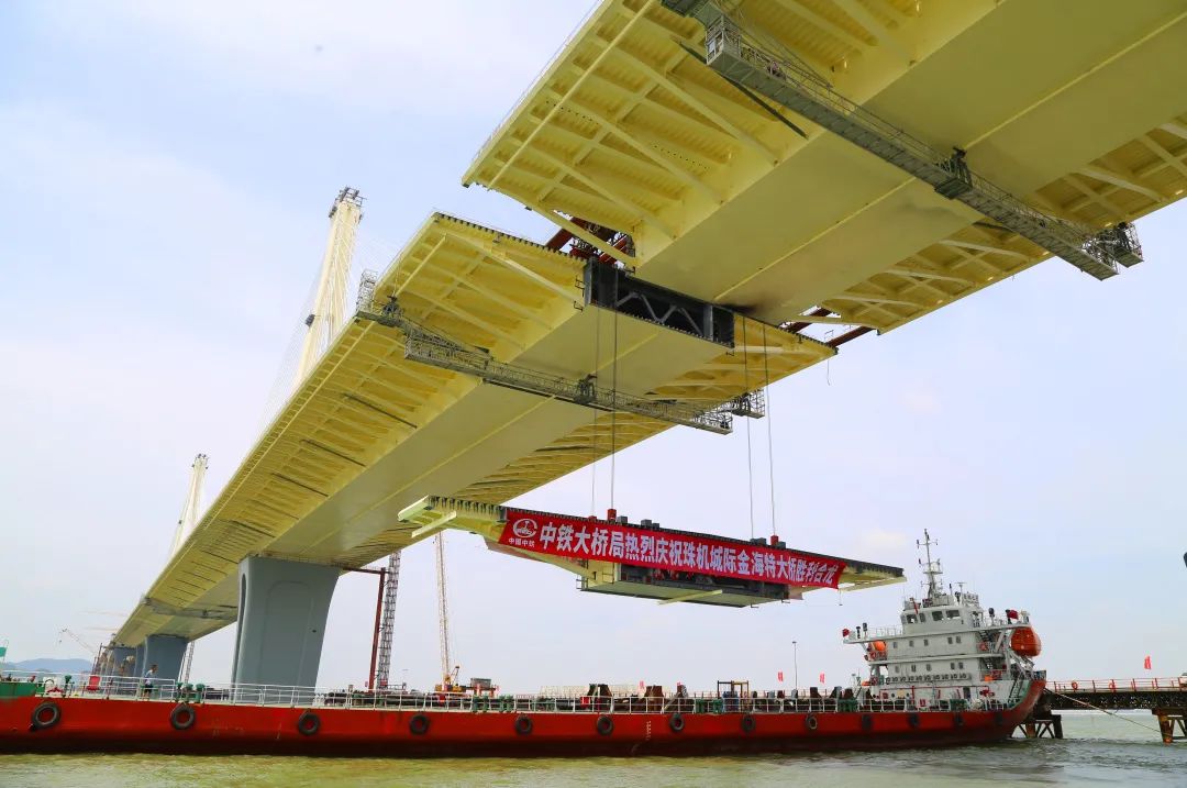 其中,4个钢主塔、8个大节段钢梁由中铁大桥局自主设计打造的国内起重量最大、起升高度最高的双臂架起重船“海鸥号”3600吨起重船架设;36块标准钢箱梁由750吨架桥机架设;3块合龙段钢箱梁由吊架+连续千斤顶提升合龙。