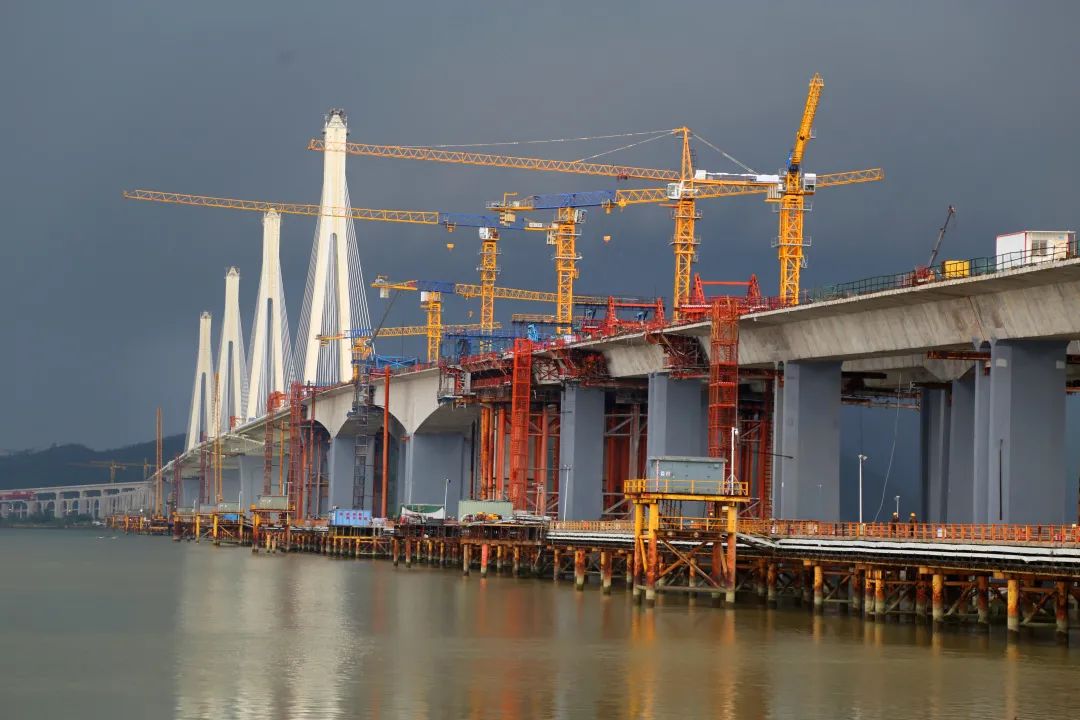 珠机城际金海大桥为粤港澳大湾区重点工程,是世界首座公铁同层多塔斜拉桥,也是目前世界上最宽公铁两用多塔斜拉桥。