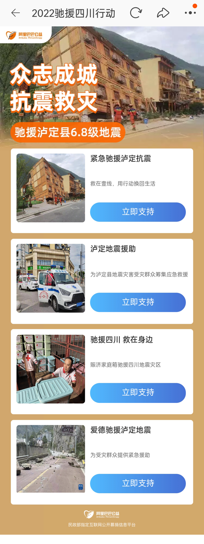 此外,阿里公益于5日晚间,与中国红十字基金会、中华社会救助基金会、壹基金、爱德基金会等公益组织一起,在阿里“95公益周”会场联合发起募捐救助行动。