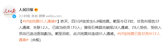 据人民日报最新报道,截至9月6日7时,泸定6.8级地震已致65人遇难、失联12人,已收治伤员170人(其中:重伤56人)。余震不断,已发生3.0级及以上余震10次。国家地震应急响应级别提升至二级。