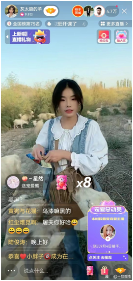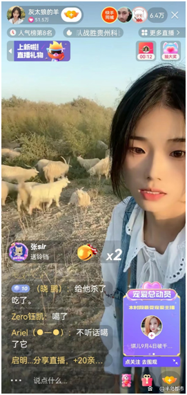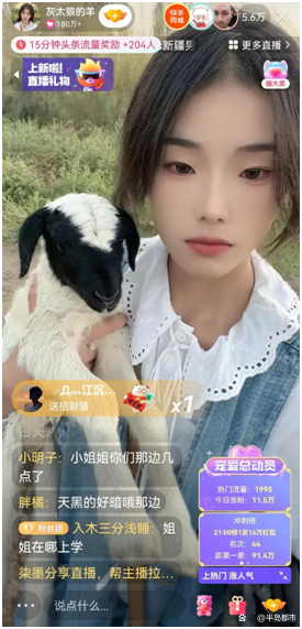 噶羊少女惠然的爆火,也彰显出快手上丰富多元的农村生活题材内容,正受到越来越多人的喜爱。同在新疆尉犁县的主播“疆域阿力木”,此前就凭借“你的背景太假了”走红全网。而在惠然本次快手首播中,她不仅带着观众们“云牧羊”,也在一片落日夕阳中让更多人看见了独特的新疆美景。整场直播观看人数近700万,登上了同时段新疆地区直播间热度榜第1名。