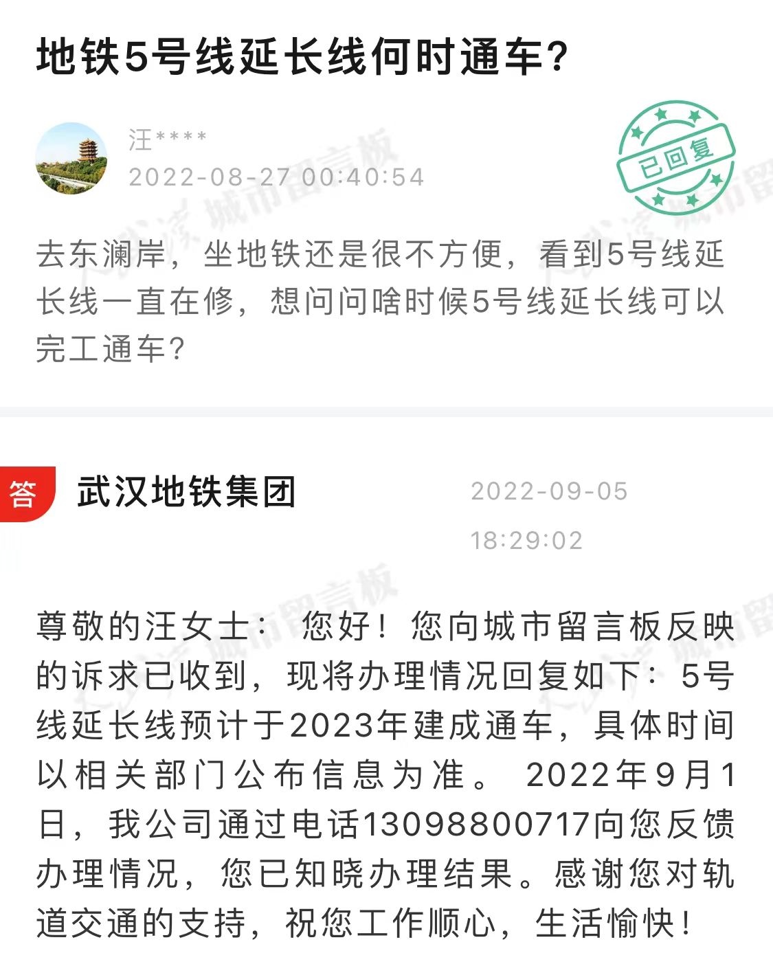 近日,有网友在武汉城市留言板上咨询,地铁5号线延长线何时可以完工通车?对于网友的问题,武汉地铁集团于昨日(9月5日)回复称,地铁5号线延长线预计于2023年建成通车,具体时间以相关部门公布信息为准。