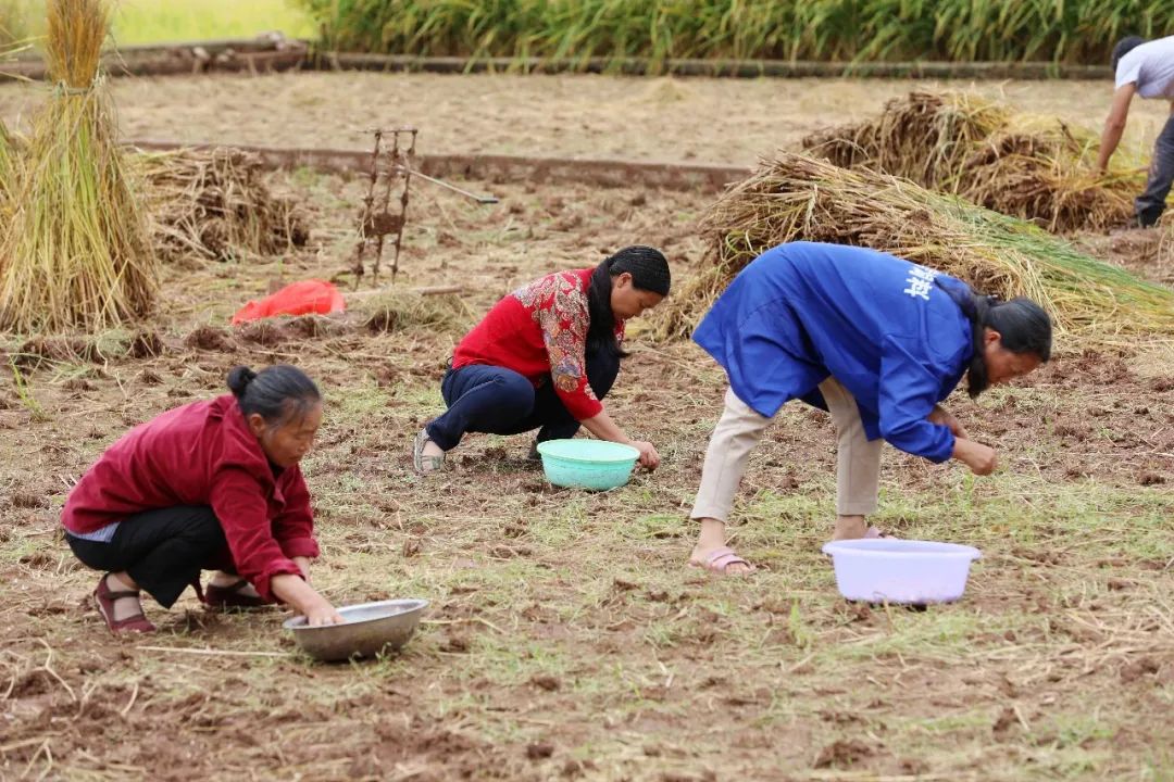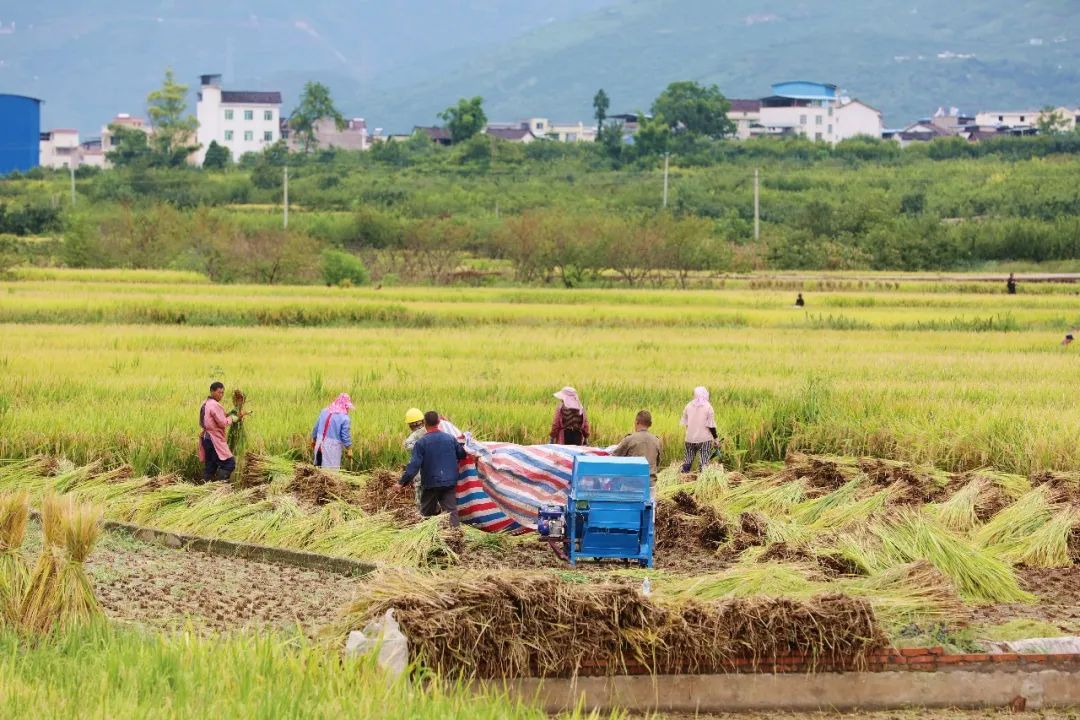 稻田里,打谷机与谷粒碰撞的轰隆声,镰刀割断谷杆的唰唰声,农民伯伯推动机器时发出的吆喝声……此起彼伏,不绝于耳。