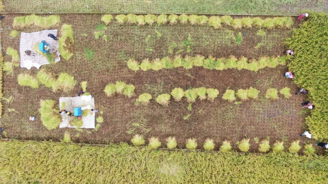稻田里,稻农们抢抓好天气,在水稻田间来回穿梭,阵阵稻香扑面而来,一派丰收的喜人景象。