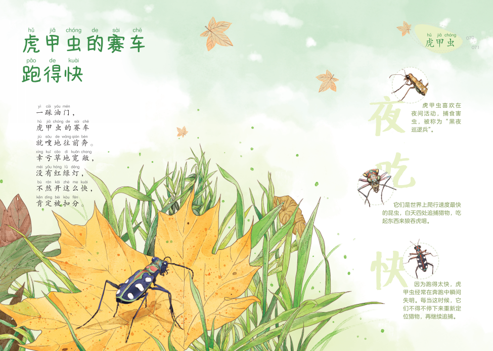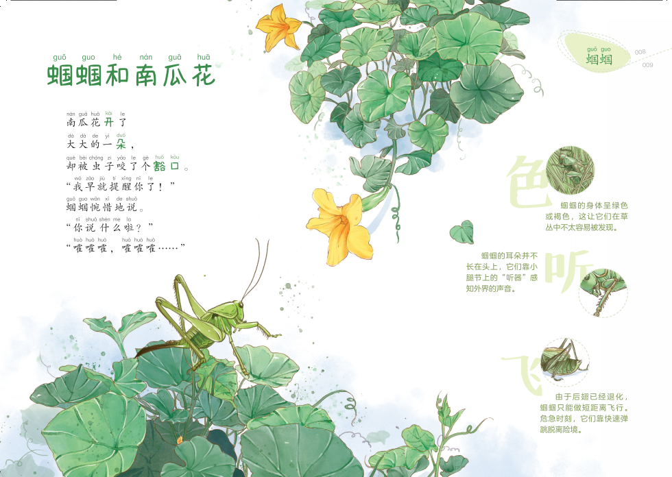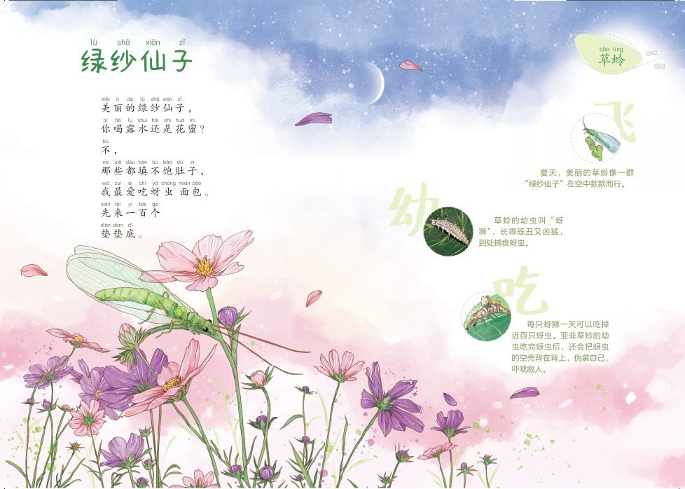 例如《草精灵》这本童诗集,就带着小读者去认识了节节草、知风草、白车轴草、酢浆草、打碗碗花、爬山虎、灯笼草、紫斑风铃草、凤仙花、田字草、狗尾草等50种姿态各异的花草。
