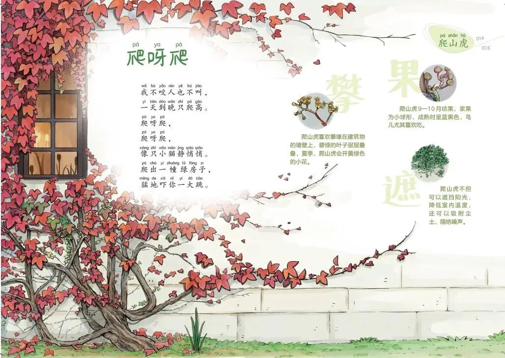 这是一首标准的“谜语诗”。不论是题目,还是诗歌里写的内容,都会引起小读者去“猜谜”的兴趣。等你看到诗歌后面的小科普知识,才会恍然大悟,原来这首小诗写的是爬山虎!