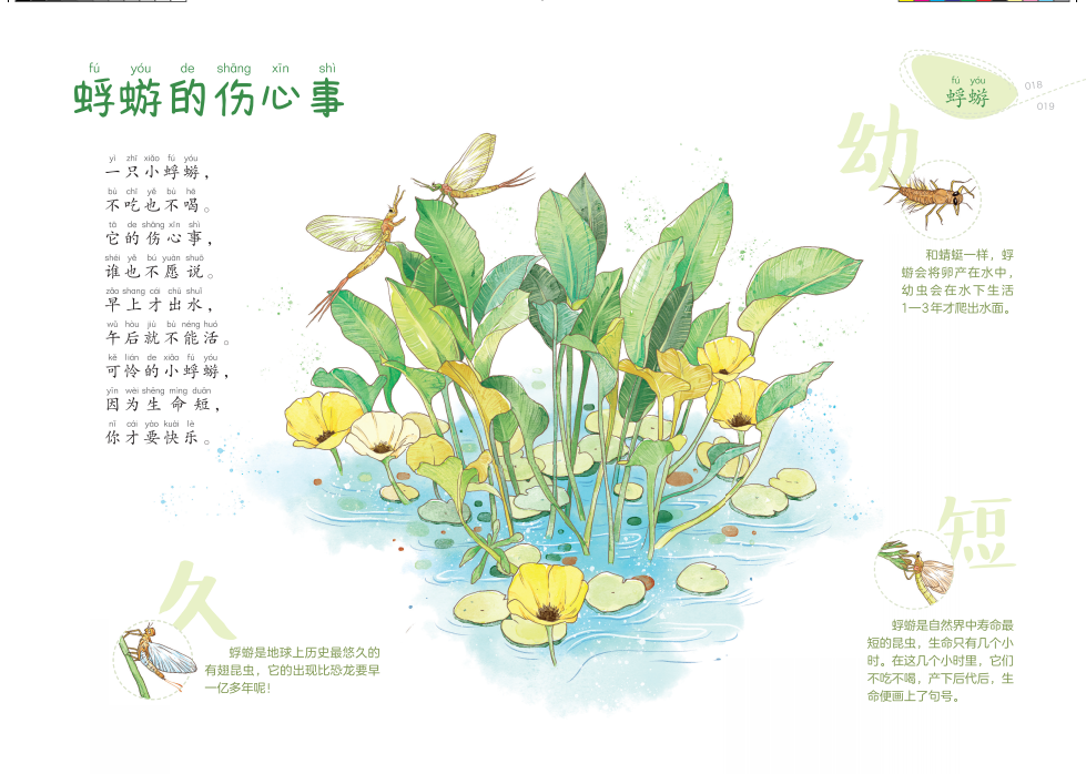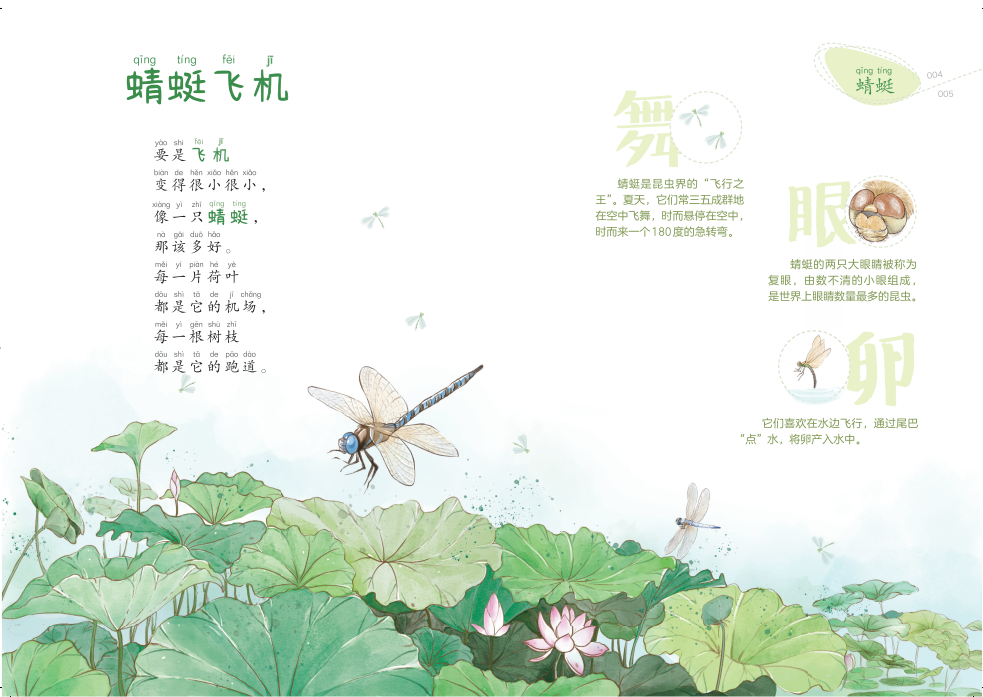 诗里有想象,有比喻,有夸张,还有小小的抒情。作者在后面的小知识里,又补充了一些蜻蜓的生活习性:蜻蜓是昆虫界的“飞行之王”。夏天,它们常三五成群地在空中飞舞,时而悬停在空中,时而来一个180度的急转弯。蜻蜓的两只大眼睛被称为复眼,由数不清的小眼组成,是世界上眼睛最多的昆虫。它们喜欢在水边飞行,通过尾巴“点”水,将卵产入水中。