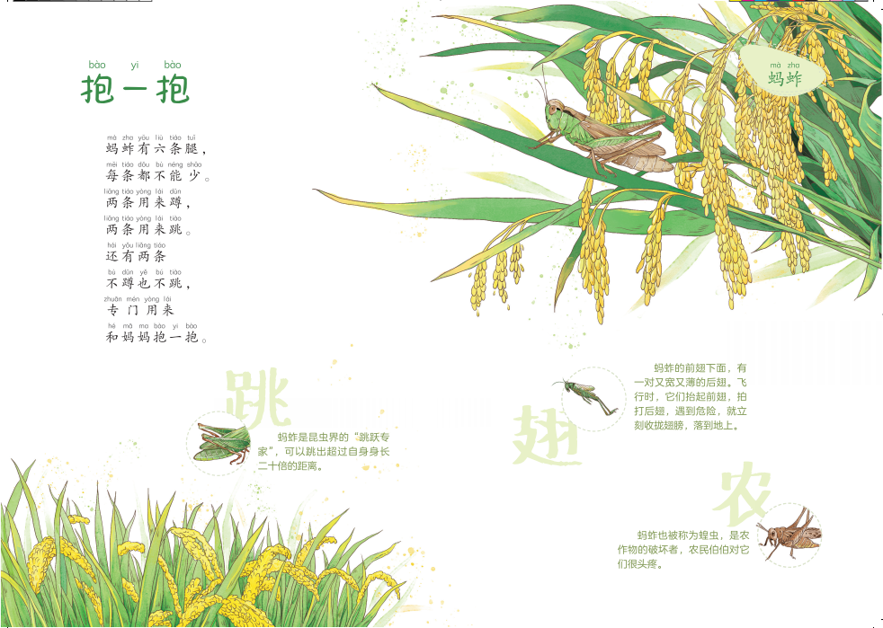 再如《抱一抱》,写的是蚂蚱的生命特征,却写出了一种温暖的亲情: