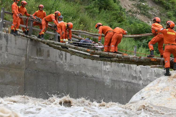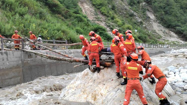 “近期连续下雨,河水上涨,原有的桥梁垮塌,救援人员无法到达。雅江大队先蹚水到河对面,现场伐木,很快就制作完成了简易的生命救援桥梁。”姚强强介绍,救援人员从独木桥通过后,前往青岗坪村搜救。最远的一户人家离独木桥有三四公里,救援人员使用竹竿制作的简易担架,将伤员转送至独木桥边,再由桥对面的救援人员将其转运四公里外的救护车上。“这四公里山路转运十分困难,基本没有路,还要翻越滑坡地段,走河道、爬山。由于是转运伤员,必须快、稳,防止伤员受到二次伤害。这短短四公里山路,我们走了一个小时左右。”