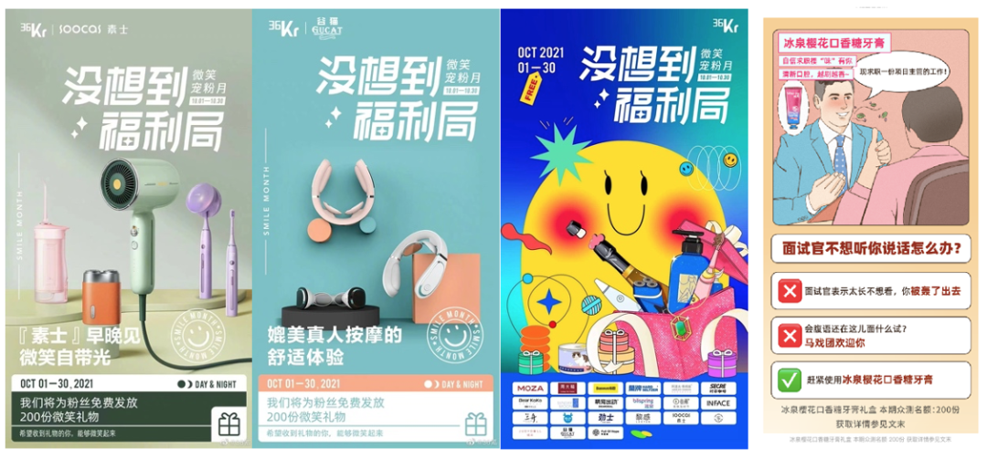 2021年9月至10月,36氪没想到福利局联合24个品牌联合发起2021年· 36氪微笑宠粉月,参与的品牌方包括周大福金币金章、素士电动剃须、冲牙器、吹风机、电动牙刷、魔爪手机云台等。36氪以趣味漫画合辑的方式在微信公众号发布并介绍品牌产品,同时在微博发起对应话题引爆全网,其中#没想到福利局#微博话题阅读量高达503.9W。