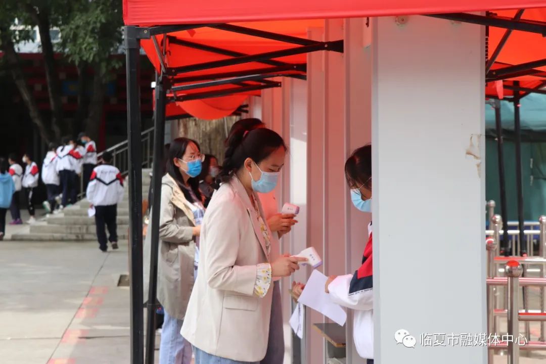 9月5日上午,在临夏市第一中学门口,学生们正在排队,配合老师测量体温,有序经过体温检测通道后进入校园。学校负责人告诉记者,开学前,学校已经对学生的行程进行了精准摸排,并督促师生及学校员工提前14天做好自我健康检测。