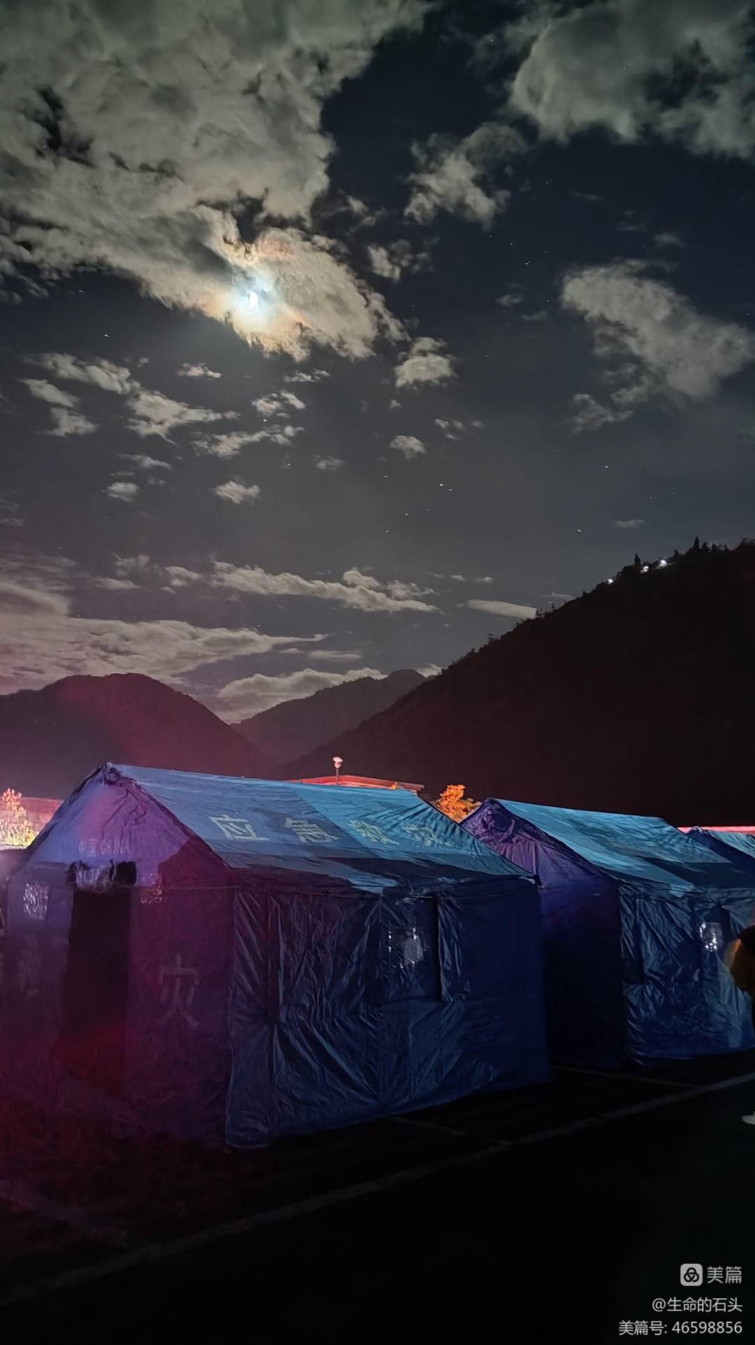 地震发生后,磨西古镇所有居民与游客被集中到古镇游客中心的两个广场上。据石老师回忆,当地政府工作人员以及志愿者迅速搬来了帐篷和救援物资,所有人在广场上开始了帐篷搭建。不到两小时,大量的救援队和车辆开始驶入,包括物资车辆以及信号车辆。