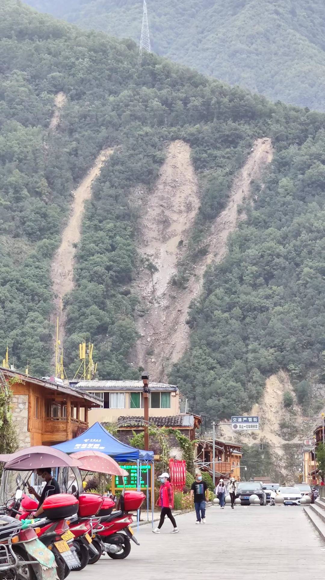 石老师讲述道,由于地震前泸定县都在下大雨,地震发生后,随处可见山石滑坡和泥石流,次生灾害频发非常危险。即便如此,救援人员正在尽最大努力抢修道路,确保民众安全。同时,石老师也看到,大量受灾村民正在被陆续转移到磨西古镇上的临时安置点,大家都在有序领取物资,根据安排行动。