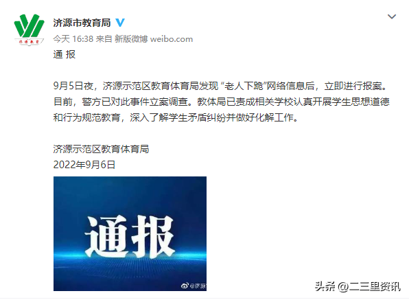 9月6日,河南济源示范区教育体育局通报,9月5日夜,济源示范区教育体育局发现 “老人下跪”网络信息后,立即进行报案。