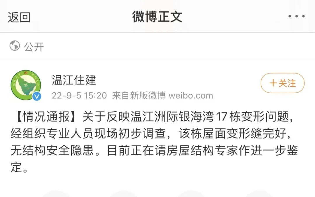 针对网传信息,成都市温江区住房和城乡建设局通过官方微博@温江住建发布情况通报:关于反映温江洲际银海湾17栋变形问题,经组织专业人员现场初步调查,该栋屋面变形缝完好,无结构安全隐患。目前正在请房屋结构专家作进一步鉴定。