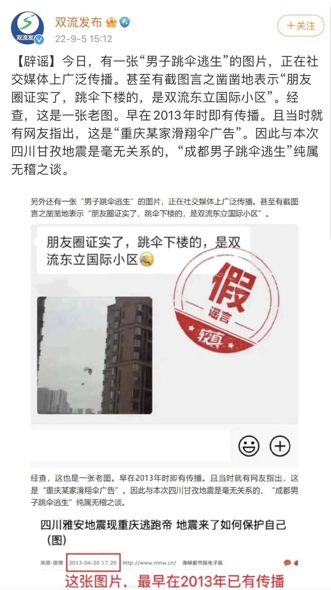 针对网传信息,成都市双流区互联网新闻信息中心通过官方微博@双流发布辟谣:经查,这是一张老图,早在2013年时即有传播。且当时就有网民指出,这是“重庆某家滑翔伞广告”。因此与本次四川甘孜地震是毫无关系的,“成都男子跳伞逃生”纯属无稽之谈。