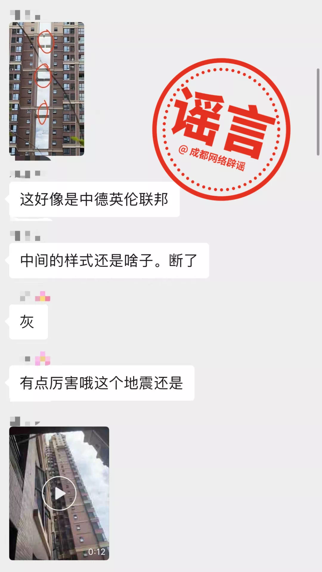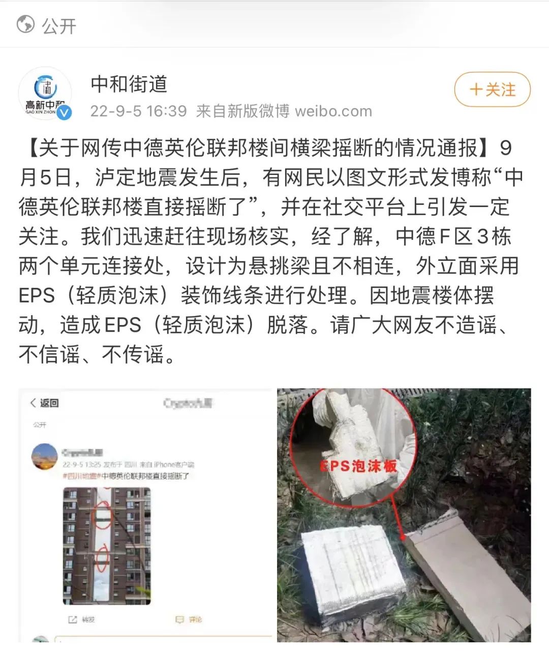 针对网传信息,成都市高新区中和街道办事处通过官方微博@中和街道发布情况通报:经了解,中德F区3栋两个单元连接处,设计为悬挑梁且不相连,外立面采用EPS(轻质泡沫)装饰线条进行处理。因地震楼体摆动,造成EPS(轻质泡沫)脱落。