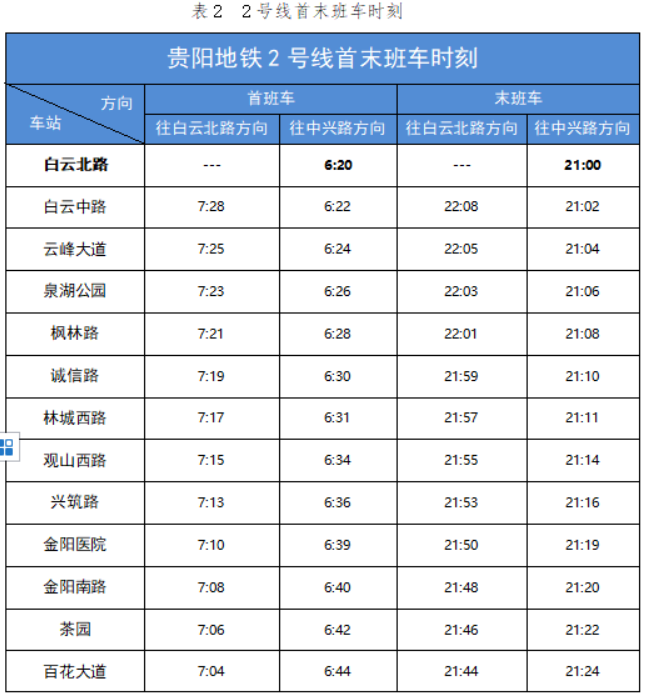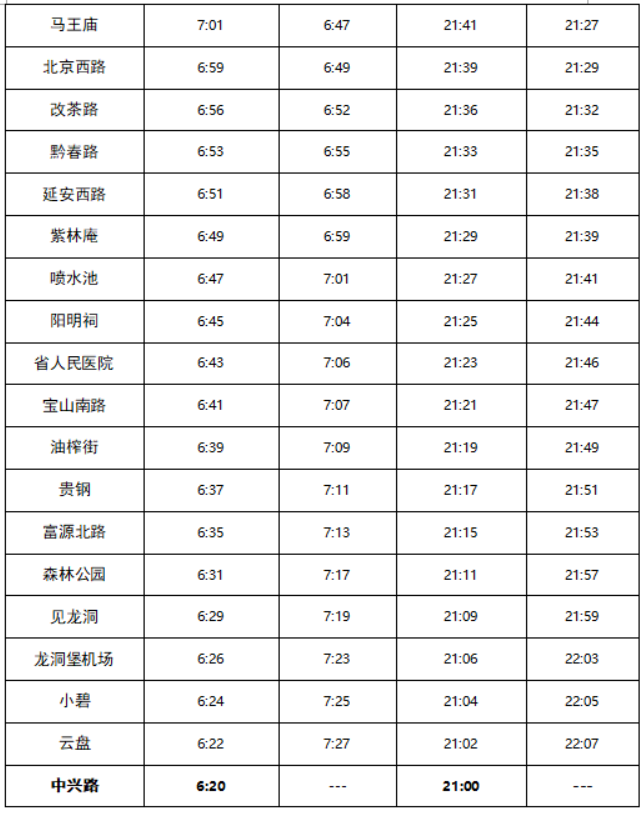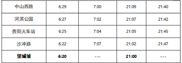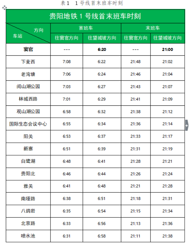 记者从贵阳市公共交通投资运营集团获悉,根据上级疫情防控要求,同时兼顾疫情保障人员出行需求,自9月6日起,贵阳地铁1、2号线两端站首班车时间恢复为06:20,末班车时间为21:00,部分中间站首班车时间较正常运营期间有所调整,高峰期发车间隔为20分钟(7点至9点,17点至19点),平峰期发车间隔为1小时。1号线珠江路站、长江路站、清水江路站、小孟工业园站继续停止运营服务。所有乘客凭24小时核酸阴性证明乘坐地铁,给您造成的不便敬请谅解,如需帮助可及时拨打贵阳地铁服务热线0851—87166669。感谢各位乘客的理解与支持。