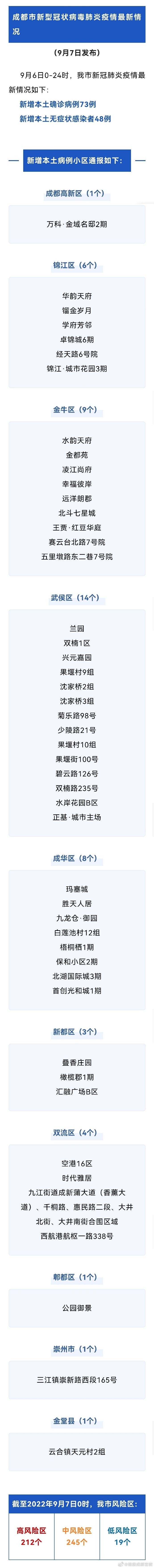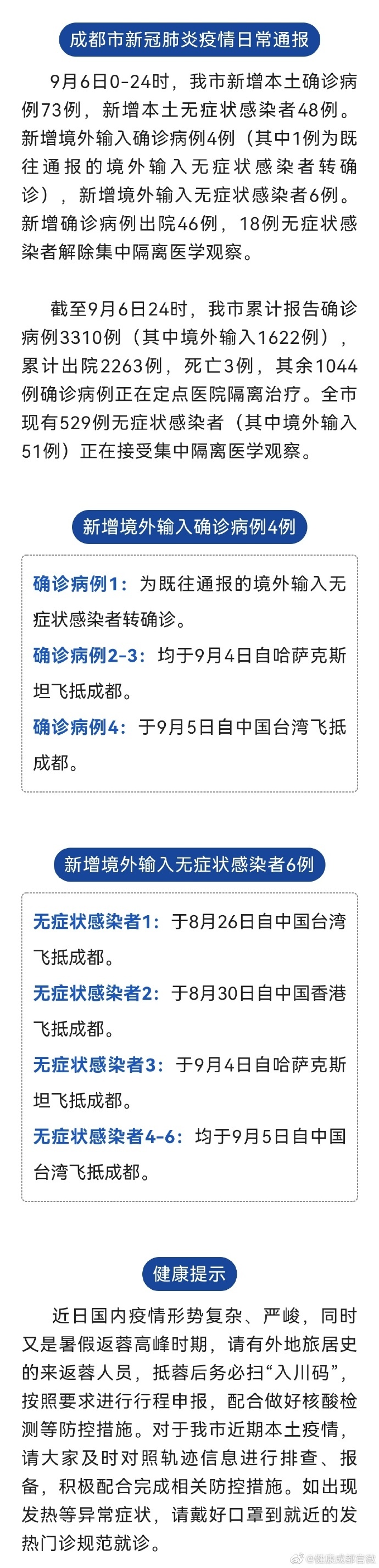 9月6日0-24时,我市新增本土确诊病例73例,新增本土无症状感染者48例