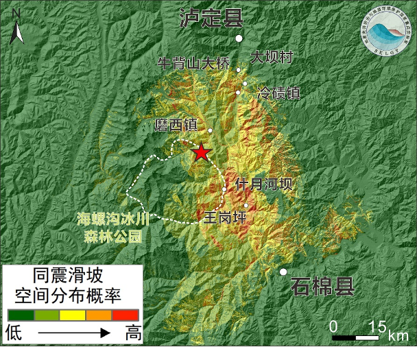 其中石棉县城至王岗坪景区道路沿线有极大可能受到地震诱发地质灾害影响,震中所在的海螺沟国家森林公园东部区域空间分布概率也较高;