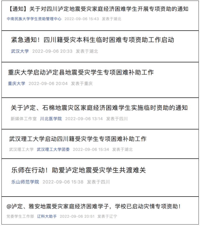 地震发生后,包括武汉大学、中南民族大学、重庆大学等在内的全国多所高校发布通知:对四川泸定地震受灾家庭经济困难学生开展专项资助。