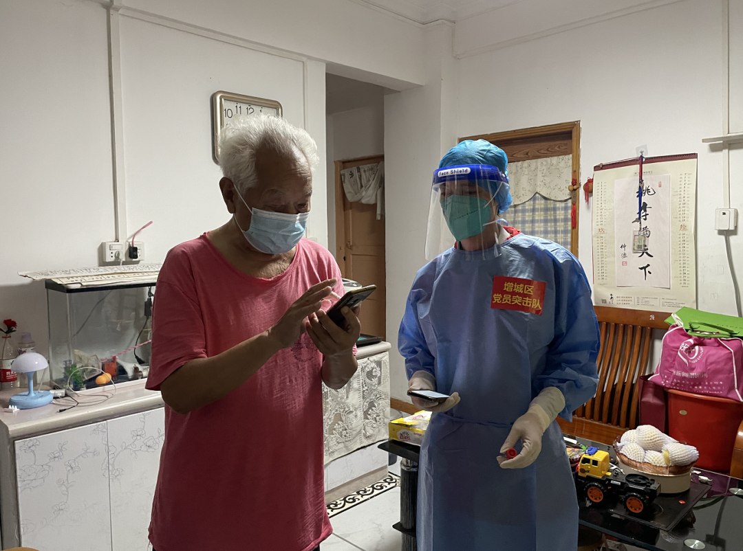 在疫情防控中,“三人小组” 是筑牢疫情防控严密防线的关键。增城区党员突击队还组成了1个“三人小组”负责配合居委进行重点人员上门排查工作,潘立华就是“三人小组”中的一名成员。“爷爷,张开嘴!”“说‘啊’……”9月5日晚上八时许,潘立华和“三人小组”成员上门为一位105岁的高龄独居老人做核酸检测。老人行动不便而且有些耳背,潘立华耐心地、多次重复向老人说明情况,并帮助他打开核酸采样码录入信息。