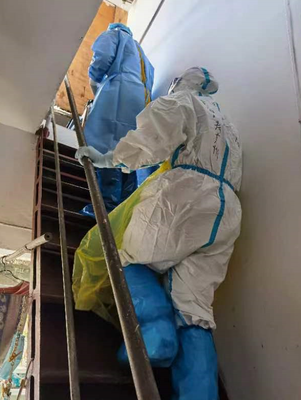 在疫情防控一线,少不了“大白”的身影。由于江南中街道的老旧小区较多,大部分小区都没有安装电梯。为配合“三人小组”上门排查工作,来自广医四院的医护人员单佩珊身穿闷热的防护服,一口气爬上9楼、在烈日下徒步前往居民家中进行核酸采样是她的日常,被汗水浸湿的上衣、被口罩勒红的脸庞是她的“荣誉”象征。