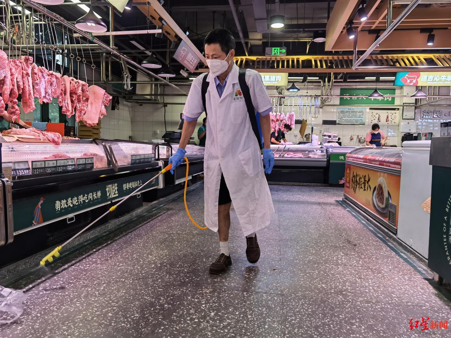 中午1点钟,市民采购高峰期已过,益民菜市东苑店店长兰才琼和市场的管理员、志愿者们关上店门,开始对市场内进行全面消杀,同时开始补充货物。从9月7日起,益民菜市各门店于每日13:00-14:00闭店补货、消杀,用充足的货品迎接下午采购的市民。购物的市民可以避开这个时间段前往市场。