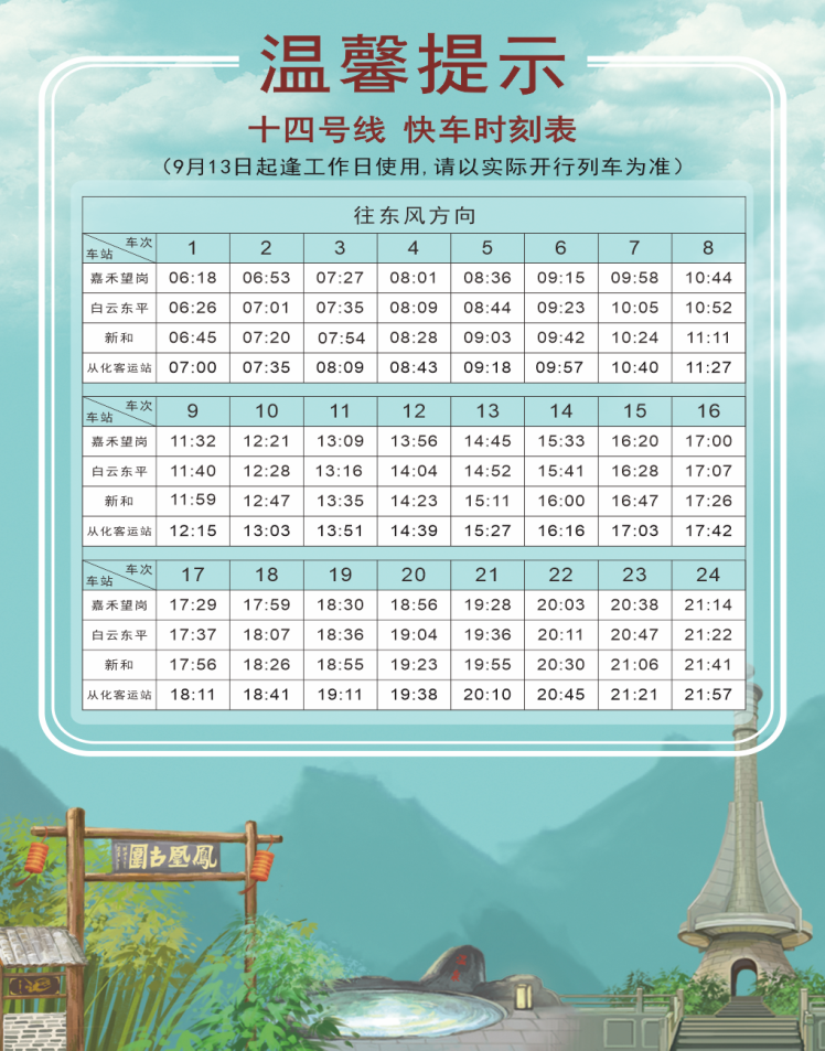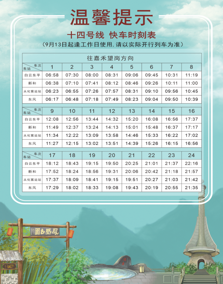 广州地铁提醒,快车的实际到站时间会根据线路运营组织情况有所调整,快车时刻表仅做参考,搭乘时请以车站现场广播和电视上的列车到站信息为准。