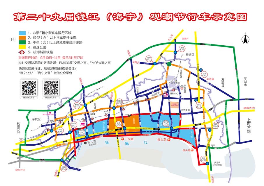 今年钱江(海宁)观潮节将于9月8日至9月17日在海宁举行。记者从省公安厅了解到,为保障第二十九届钱江(海宁)观潮节期间道路交通安全畅通,省公安厅决定对海宁观潮景区及周边道路实施临时交通限行措施。限行时间为2022年9月10日至14日(农历八月十五至十九)每日8时至17时。确有需要进入限行区域的非嘉兴籍小型客车,可通过“海宁公安”“海宁交警”微信公众号申领《限行区域通行证》,通行证当日有效。据了解,今年海宁观潮沿线仅有停车位1万个左右,其中盐官景区车位仅有5000个左右。警方提醒大家尽量选择公共交通出行或拼车出行。