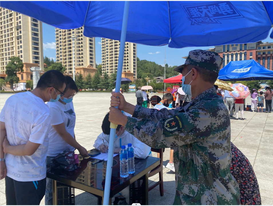 9月6日上午,在县委广场核酸采样点,退役军人黄艳红和他的战友正协助社区工作人员在现场维护秩序,引导市民。身为退役军人的黄艳红,从2020年志愿服务队成立以来就积极参加各种志愿者工作。