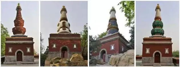 颐和园后山须弥灵境主殿香岩宗乘之阁前建有四大部洲和八小部洲,四大部洲以四座过门塔为代表,是四座以砖石筑的覆钵式塔,四塔分别用四种颜色代表佛教的“四智”,并分别冠以北俱庐洲、南瞻部洲、东胜神州和西牛贺州之名。塔的下面是一个方形台座,南北两面开圆洞门,游人和香客可从门洞内穿过,正是过门塔的传统做法。颐和园的前身清漪园在咸丰十年(1860)与畅春园、圆明园等一起被英法侵略军焚毁,这四座过门塔是幸存的劫余之物,造型精美独特,被人们称为红、白、黑、绿四塔,今天去颐和园后山仍可得见。