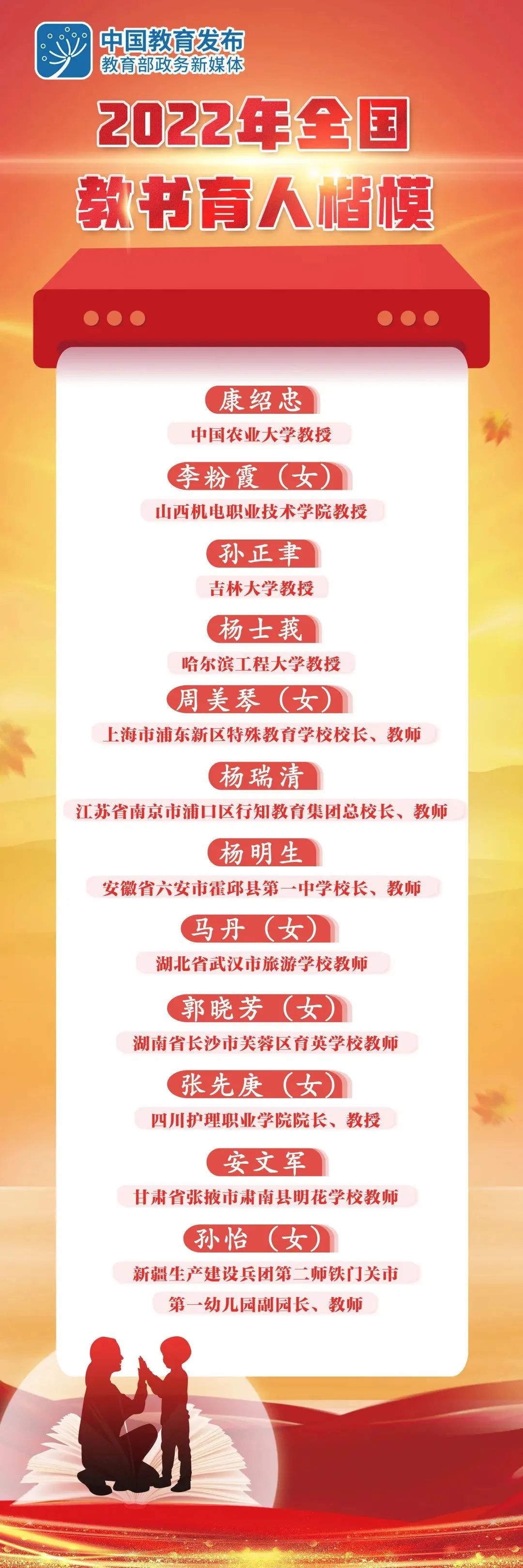 这12位教师,在高教、职教、幼教、特教、基础教育等不同岗位,始终牢记为党育人、为国育才使命,坚持立德树人,坚守“四个相统一”,当好“四个引路人”,贡献特别突出,事迹特别感人。他们有的深耕思政课堂、传播党的创新理论,有的勇攀科研高峰、取得显著成果,有的一辈子扎根基层、矢志奉献山区教育,有的创新思路方法、为孩子倾注大爱深情,充分展示了新时代教师队伍有理想信念、有道德情操、有扎实学识、有仁爱之心的良好精神风貌,是广大人民教师的优秀代表和杰出典范,无愧于全国教书育人楷模的光荣称号!