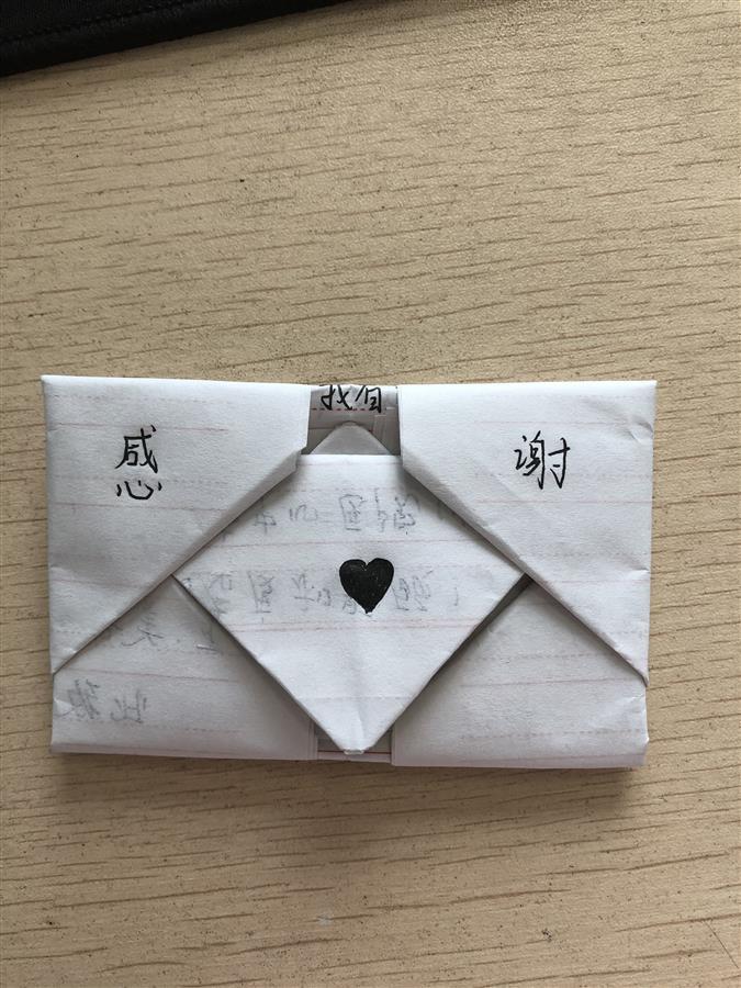 “心”形折纸封面,画了“爱心”,两边分别写下“感”“谢”。打开折纸后,是两张信纸。“住院6天,看到了经验丰富的麻醉医生胡平,医术卓越的毛小刚和何付冰冰医生,护士长代洁,责任护士杨正银、陈婷婷……”信纸上,王女士写下了就诊点滴和感受。